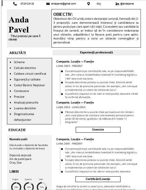 - Limbi străine: enumerați limbile străine pe care le cunoașteți și nivelul de competență în fiecare dintre ele.