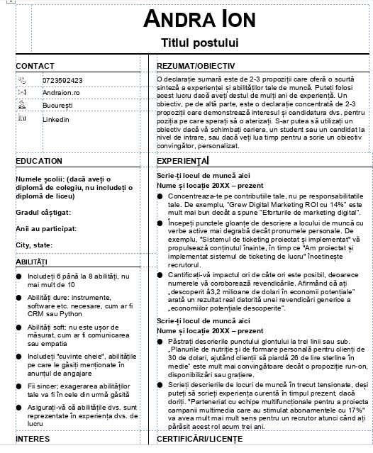 Un model ușor de editat în programele word sau openOffice Word care este și gratuit. Tot ce va trebui să completezi este: numele tău, adresa, locul de muncă dorit, educație, experiență și cam atât.